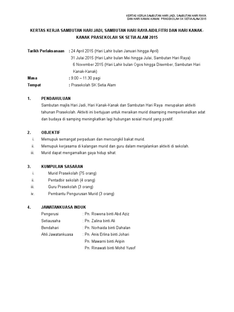 Semua murid SMK Seri Bintang Selatan tulis jumlah murid berdasarkan pengagihan bulan tersebut 50 Objektif. AKTIVITI RPA BERTEMA TEMA. Kertas kerja sambutan hari jadi prasekolah cemerlang sk tok kepak jan dis 2016.